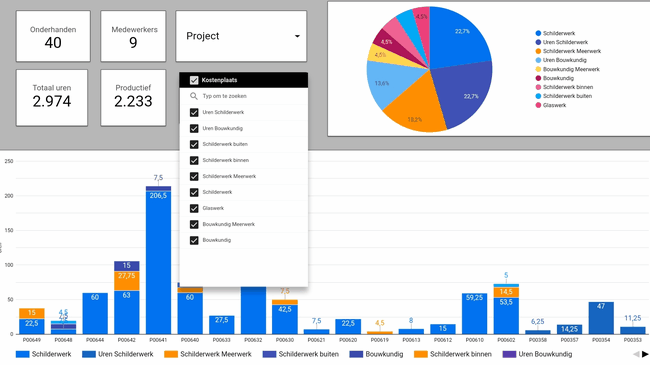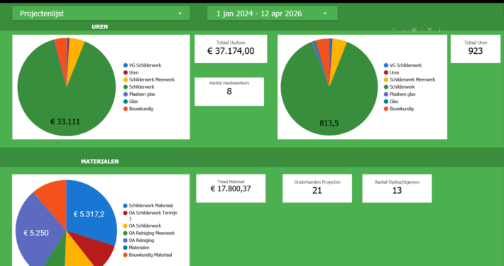Visuele rapportages: Heldere taartdiagrammen tonen de verdeling per discipline (bijv. schilderwerk vs. bouwkundig).